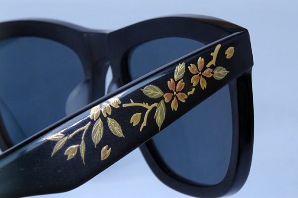 Re:RENEW/2020開催時に合わせ、当店でも行ったオリジナル企画、越前漆器とコラボしての特別加飾、この企画で沈金・蒔絵加工のお問い合わせを何件かいただき、ご注文に至らないケースが数件ありました。 特に沈金加工については、彫る為のキャンバスの広さ、がどうしても必要な為、LINEで画像を拝見しますと必要幅が足りない、と残念な回答をする事に。 絵筆で描く蒔絵と違い、彫刻刀のような刃物で彫る沈金は、2㎝ほどの幅が必要になります。 その為めがねのテンプル部分に施そうとしますと、極太と呼ばれるぐらいの太さを要しますので、適合するフレームはなかなかありません。 そんなこともあり、沈金加工しためがねはいったいどのような雰囲気になるのか あまりご紹介出来ていなかったので、今回かなり太めのサングラスを用意し、サンプル作成して頂きました。 早速 腕利きの沈金職人さんに相談した所、女性もののサングラスなので 点彫りにて色違いのバラを彫りましょう、となりました。 彫られた段階ではほとんど分からないバラの模様が、色粉を沈めると浮かび上がり、見事にバラが咲きました。 蒔絵とは違った表現の沈金は、彫られている為 立体的で存在感があります。 画像をよくご覧いただきますと、金粉や色粉を微妙にグラデーションさせ、陰影をつけているのも分かります。 沈金は彫り込まれている為劣化しにくく、永く現状を楽しめるのも優れた点です。 器やお盆として、華やかさを末永く保つ、古来より続く伝統の技法には 裏付けされる理由がきちんとあるのです。 加工ご依頼をお考えの方、沈金の質感や加工に必要な太さなど、ぜひご参考下さい。