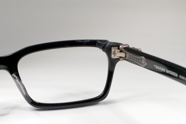当店の修復・復刻実績1,2位を争う事例の多さを誇るブランド、クロムハーツ。 何故このブランドは特にご依頼が多いのでしょうか? 考えられる事は ①ブランドを好むユーザー数が多い. ②商品に欠陥がある. ③その他. このフレームを見た限りでは、②の欠陥品ではないようです。 ①はまさしくその通りであると言えます。 では③その他、にはどの様な事が考えられるのか、いくつか可能性を考えてみました。 理由の大きな一つとして、高額のブランドである事、は間違いありません。 購入費用よりも高くなる加工費であれば、一般的に新しく買い求める事が多く、ショップの店員さんもそちらを勧めますが、購入費より安価で加工が済む場合、加工を望まれる方の割合が増えるのは必然です。 次に人気ブランドゆえに起こる、模造品・特価品・転売品などによる大量消費も①の理由に紐づけられます。 こちらに関しましては、正規品を求めて頂くしかありませんが、どの業界でも起きている悩みの種です。 幸いこのクロムハーツは シルバーの飾りを装飾する事で、製造の精度・コストが上がり 模造品(複製品)発生を大幅に防いでいるように思います。 考えられる理由としては、この様な感じでしょうか。 今回ご依頼のこのフレームは残念ながら接着剤を使用された為、加工後使用厳禁の修復再生となりましたが、接着剤を使っていなければ 綺麗にご使用できるよう加工出来ました。 この掲載をご覧の皆様、もしも破損後接着剤を使われ どうしても使いたい場合、様々な復刻方法があります。 高額になりますが、どうしてもという場合 一度ご相談ください。