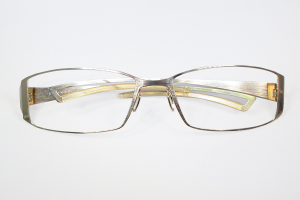 とても細いステンレス製のシルバーメッキのフレームです。 シルバー色+素材が板状ということで、全体的にクールで涼しげな印象のフレームですが、全体を暖色系の塗装を施してイメージをガラッと変えました。 微妙にグラデーションをかけ、ワンポイントで黒を入れる事で明るい中にもキリッと引き締まった一面も出せました。 ※ネジで止まる部分などの可動部は塗装がはがれますのでご注意ねがいます。