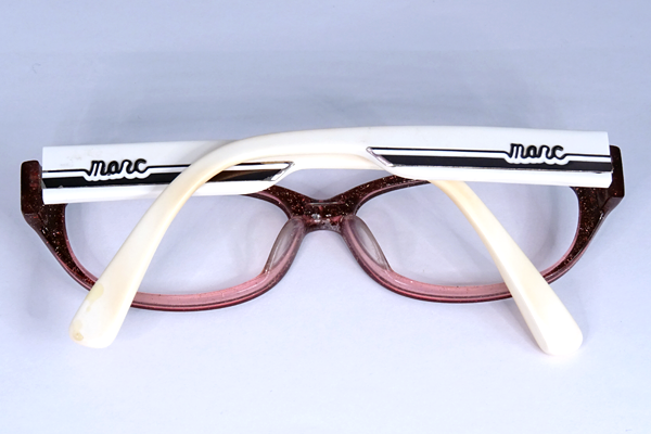 アメリカ合衆国ニューヨーク生まれのファッションデザイナー、マークジェイコブスのプラスチックフレームのテンプル部分変色と、ブリッチ部分折れの修復再生でご依頼いただきました。 ブリッチ折れ部は接着剤を使われ、素材同士の溶着による修復は出来なくなり、特殊な樹脂にて固定しました。 今回はテンプルの変色にスポットを当てて解説します。 このような変色は主にヘアカラーによるものが多く、めがねを長時間掛けていることでプラスチック素材の中まで色が浸透し、染まってしまうために起こります。 他にも鼻あて付近の変色などは、ファンデーションによるものが多いです。 テンプルの外側だけ変色している場合は、入れているメガネケースの中に張られている生地が干渉している場合もあります。 厄介なのは、着色ではなく染色であるということです。 染まる、ということは浸透していきますので、素材の奥のほうまで入り込んでいきます。 奥まで入り込んだものは色が取りきれない場合もあるので、やはり気になったら早めに対処が一番です。 また、めがねの素材の色は不透明の白系が特に染まりやすいです。 染まってしまった場合は、表面の皮を一枚剥ぐ要領でそぎ落とし、荒・仕上げと段階をふんで研磨していきます。 一皮むくような作業になりますので、厳密に言うと元より若干痩せますのでご理解ください。(ホワイトニング作業中画像の左下ホコリ状のものは削った素材屑です)